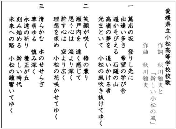 本校校歌は、テノール歌手の秋川雅史氏(西条市出身)が作詞・作曲を手がけました。